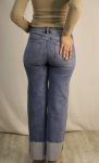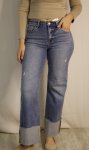 72% cotton, 26% polyester, 2% spandex, medium wash with distressing on front only, 6"cuff, 31"inseam, 11"rise, basic 5 pocket with zipper flymodel is wearing size 5machine washable