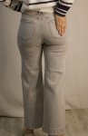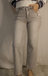 93% cotton, 5% polyester, 2% spandex, high rise washed grey jean with trouser hem, tummy control waistband, basic 5 pocket with zipper flymodel is wearing size 5machine washable