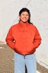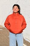 100% Polyester, Lining; 100% Polyester as well. Rusty Orange Cropped Puffer with Adjustable Toggles on Waistband, side and front zippers, double zipper with stand-up colorfleece lined, model is wearing size mediummachine washable