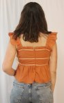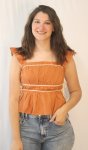 100% cotton, lined with 100% polyester, ruffled trim, cream ties on sides, zipper back 1/2 way, elastic shoulder straps with ruffled sleevesmodel is wearing size mediumdry clean only