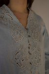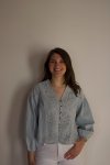 100% cotton, bleached blue denim shirt with embroidery and eyelet detail throughout, shoulder detail, scalloped edgeon waistline, v-neckline, pleated back, metal flower button closuremodel is wearing size mediumhand washable