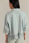 Light tint washed denim button front short balloon sleeve collared ruffle hem shirt with single chest pocket100% CottonMachine wash cold