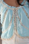 Pastel blue combo scoop neck ruffle trim button-front tank with dainty lace panels and tie detailTop: 100%Polyester Lace: 100% NylonMachine wash cold