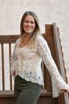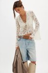 Tofu sheer lace long bell sleeve button front V-neck billowy peplum top with ruffle details64% Cotton, 36% NylonLining: 100% NylonMachine wash cold