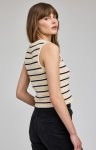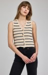100% polyester, cream/navy stripe textured knit sweater tank, v-neckline, button front closure, tailored fithand washable