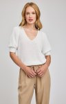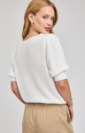 100% polyester, soft textured white sweater, puff shoulder detail on short sleeves, short waistedmodel is wearing size smallhand washable