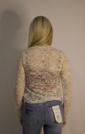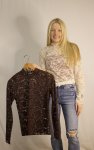 90% nylon, 10% spandex, long sleeve lace shirt has slight mock neckline, comes in chocolate brown and creammodel is wearing size smallmachine washable