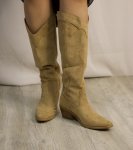 soft stretchy tall suede boot with exposed stitching detail, squared off pointed toe, wooden heel 1 1/2" heel, 15" heightmodel is wearing size 10