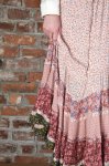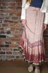 100% rayon full skirt with 100% viscose overlay, elastic waistband with adjustable drawstring, lined with 100% polyester, ditsy floral patterns pieced together, ruffle detail, colors in patterns are blush pink, mauve, olive green,