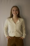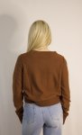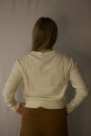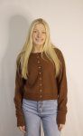50% nylon, 35% wool, 15% acrylic, button down cardigan sweater, ribbed cuffs, waist, and neckline, comes in brown and ivoryhand wash model is wearing size small