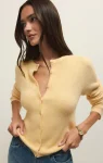 Rib midweight crewneck long sleeve button front cardiganAvailable in colors Custard (yellow) and Red LotusModel is wearing a size S44% Acrylic, 43% Nylon, 10% Viscose, 3% SpandexHand Wash Separately, Reshape and Lay Flat to Dry or Dry Clean