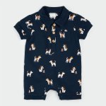 Deep blue pups at work print short sleeve polo collar beach terry romper. Snap button closure between legs100% Organic CottonMachine wash cold (inside out, gentle), tumble dry low