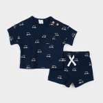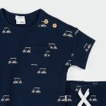 Deep navy blue thermal knit golf cart print short sleeve tee and matching drawstring waist short set. Button closure at neckline58% Organic Cotton, 38% Recycled Polyester, 4% ElastaneMachine wash cold (inside out, gentle), tumble dry low
