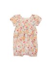 Pink floral print short cap flutter sleeve ruffle romper with elasticated cuffs and neckline. Snap closure between legs100% CottonMachine wash cold, tumble dry low