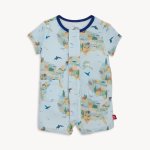 Light blue America the beautiful print short sleeve romper with magnetic closure and pockets94% Modal, 6% SpandexMachine wash cold, tumble dry lowClose all magnetic fasteners before drying to avoid product damage due to excessive heat