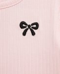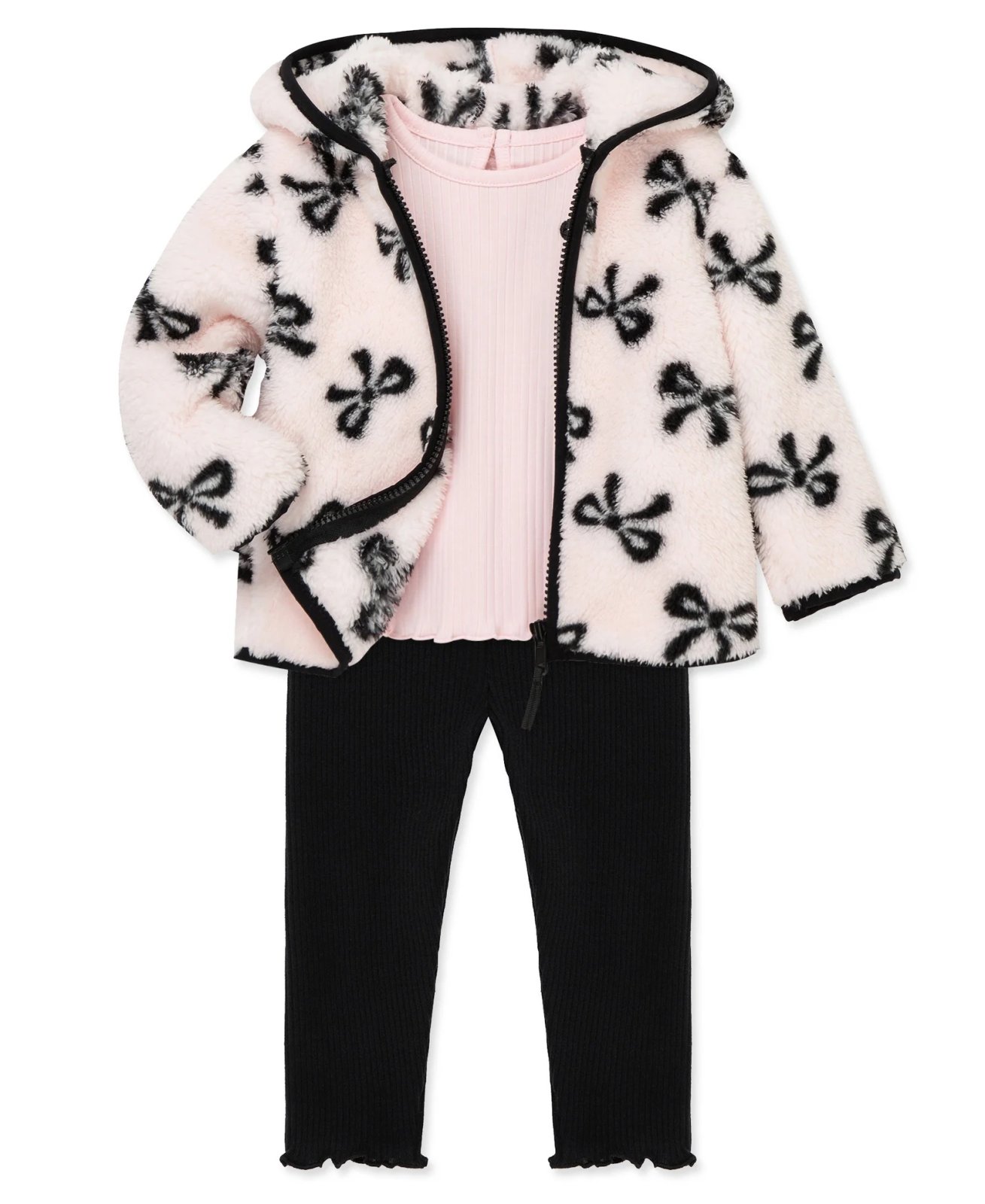Light pink bow print long sleeve sherpa jacket with matching long sleeve ribbed frilly tee (bow applique) and coordinating black stretch frill hem leggings
