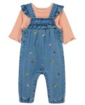 Light orange ribbed long frill sleeve tee with coordinating denim autumn leaf embroidered ruffle overalls. Snap closure between legs and at back82% Cotton, 17% Polyester, 1% SpandexMachine wash cold, tumble dry low