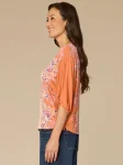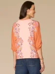 Vintage coral and sandy peach multi placement printed 3/4 blouson sleeve scoop neck knit top