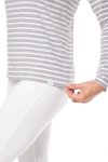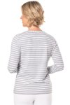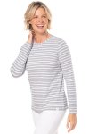 Grey and white stripe long sleeve straight hem crewneck teeModel is wearing a size MUPF 50+ Sun Protection52% Cotton, 43% Viscose from Bamboo, 5% Elastane