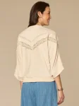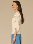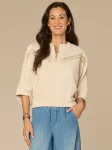 Birch 3/4 dolman sleeve mandarin collar half V-placket banded hem embroidered knit top with crochet detail