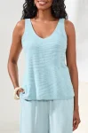 Aqua sky textured knit sleeveless V-neck sweater100% CottonHand wash cold water, separately, do not bleach, lay flat to dry, low iron if needed.
