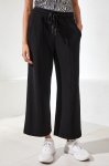 Black techno lux scuba material drawcord pull-on wide leg pant with pockets46% Polyester, 44% Rayon, 10% SpandexMachine wash normal cycle cold water, with like colors, do not bleach, tumble dry low, low iron if needed.
