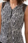 Zebra print sleeveless zip front V-neck mesh accent topUPF 50+ Performance84% Nylon 16% SpandexHand wash cold water, with like colors, do not bleach, do not tumble dry, low iron if needed.