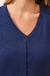 Jet blue short sleeve V-neck slub knit contrast rib double-trim tee57% Cotton, 38% Modal, 5% SpandexMachine wash normal cycle cold water, with like colors, do not bleach, tumble dry low, low iron if needed.