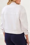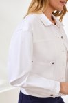 White comfort stretch denim long sleeve gold button front jacket with chest flap pockets85% Cotton, 12% Polyester, 3% SpandexWash before wear, machine wash delicate cycle cold water, separately, do not bleach, line dry, medium iron if needed.