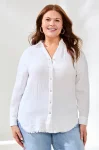White crinkled gauze raglan long sleeve button front shirt100% CottonMachine wash normal cycle cold water, with like colors, do not bleach, line dry, low iron if needed.